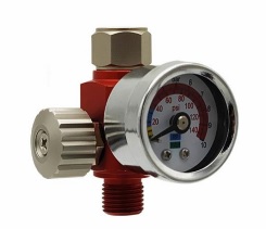 Регулятор для установки на ручку краскораспылителя, предназначен для контроля и точной регулировки давления воздуха на входе в окрасочный пистолет