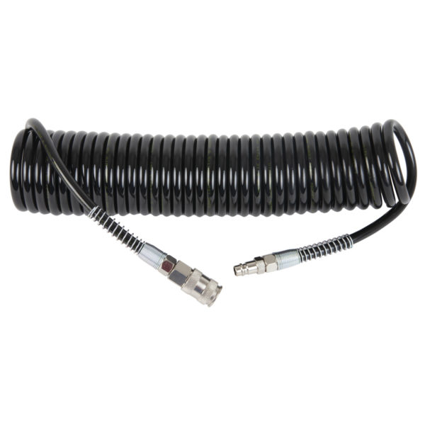 Шланг пневматический спиральный с БРС 8 м, 6.5х10 мм WDK-65758 служит удлинителем между компрессором и рабочим инструментом. Изготовлен из полиуретана, пружины защищают шланг от перегибов. Достаточная длина оснастки позволяет осуществлять работы на нужном расстоянии от компрессора. Шланг оснащен быстросъёмными фитингами рапид.