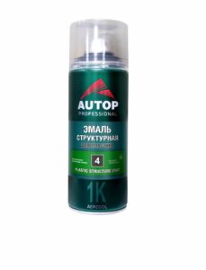 Быстросохнущая структурная эмаль предназначена для создания рельефной поверхности при ремонтной покраске пластиковых деталей автомобилей. Воспроизводит оригинальную заводскую текстуру. Скрывает неровности и участки локального ремонта. Покрытие устойчиво к механическим повреждениям и атмосферным воздействиям. Рекомендуется наносить на AUTOP №2 «Грунт адгезионный для пластика» или на AUTOP №3 «Грунт-наполнитель для пластика». Рельеф различного размера достигается изменением расстояния нанесения и заменой распылителя. Объём — 520 мл.