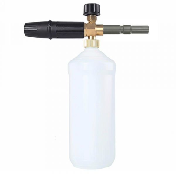 M-540504 пенная насадка предназначена для нанесения моющих средств в виде густой пены на кузов автомобиля. Пенная насадка подключается на пистолет высокого давления, через специальный адаптер KW. Вода смешивается с моющим средством и воздухом, раствор проходит через специальный вспениватель (пенную таблетку) внутри насадки, на выходе получается густая шапка пены. Также через насадку можно наносить разные виды средств для бесконтактной мойки или жидкий воск.